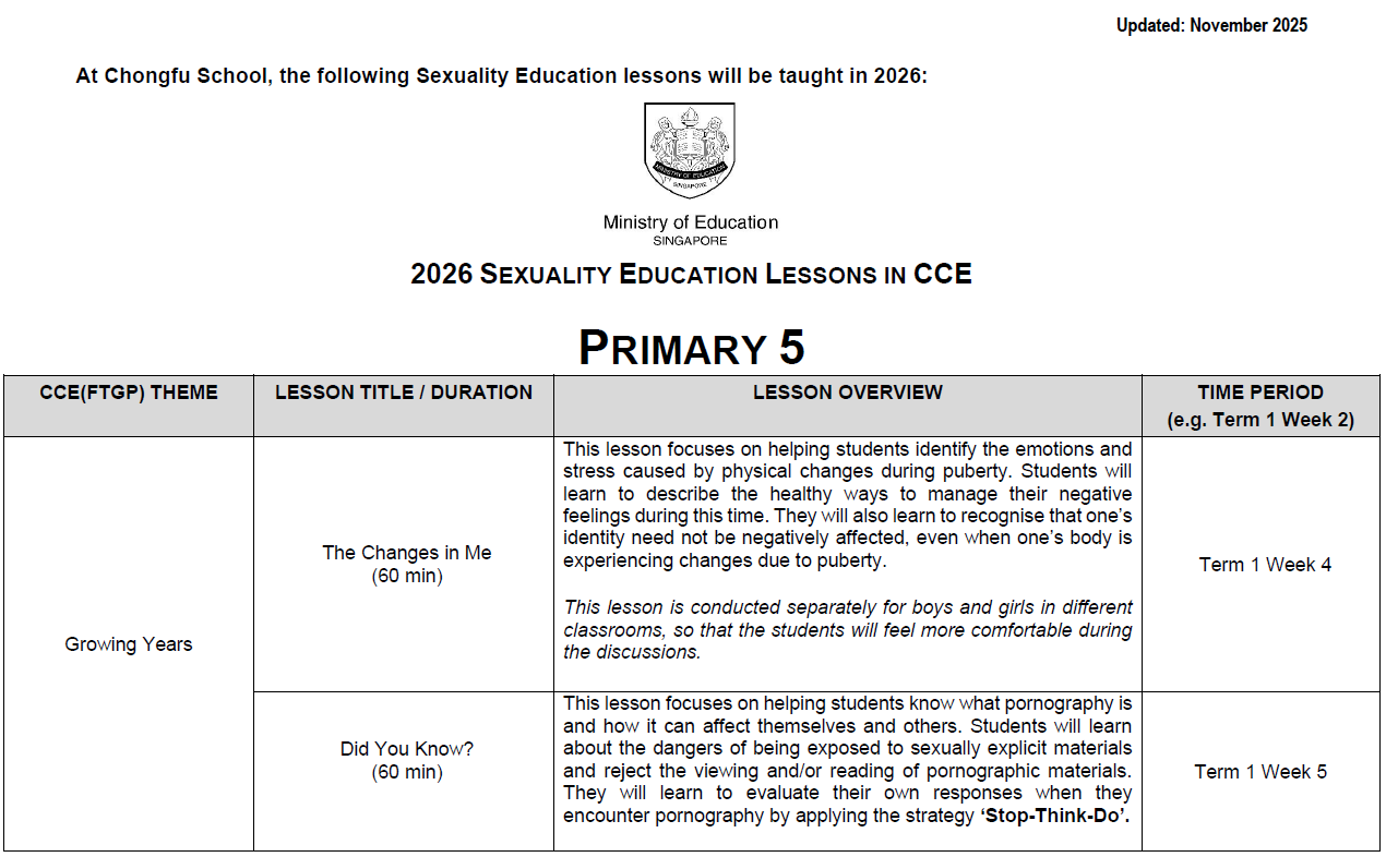 OVERVIEW OF CHONGFU SCHOOL’S SEXUALITY EDUCATION PROGRAMME FOR 2026
