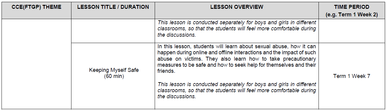 - Parents can contact the school at 67585527 for discussion or to seek clarification about the school’s Sexuality Education programme.